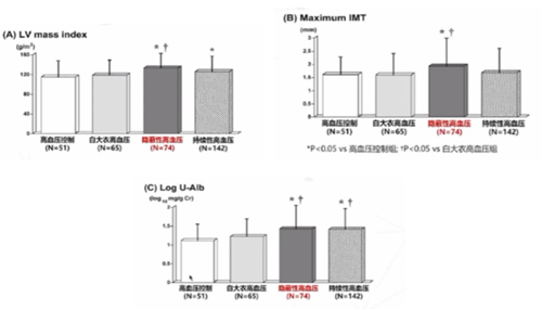 IDACO研究结果指出,隐蔽性高血压患者心血管风险较高,其靶器官损伤程度及相关的心血管风险明显高于正常血压者,且与持续性高血压患者相似(图3)。