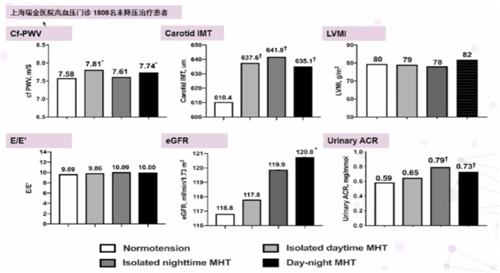 上海瑞金医院对高血压门诊1808名未接受降压治疗患者进行研究,对不同隐蔽性高血压亚型进行探索,结果发现,无论是何种隐蔽性高血压患者(白天血压增高、夜间血压增高、白天和夜间血压均增高)都会出现不同程度的肾脏、血管等靶器官损伤(图2)。